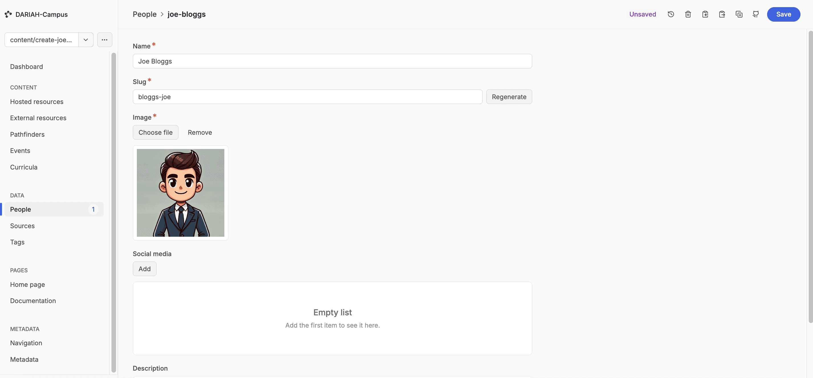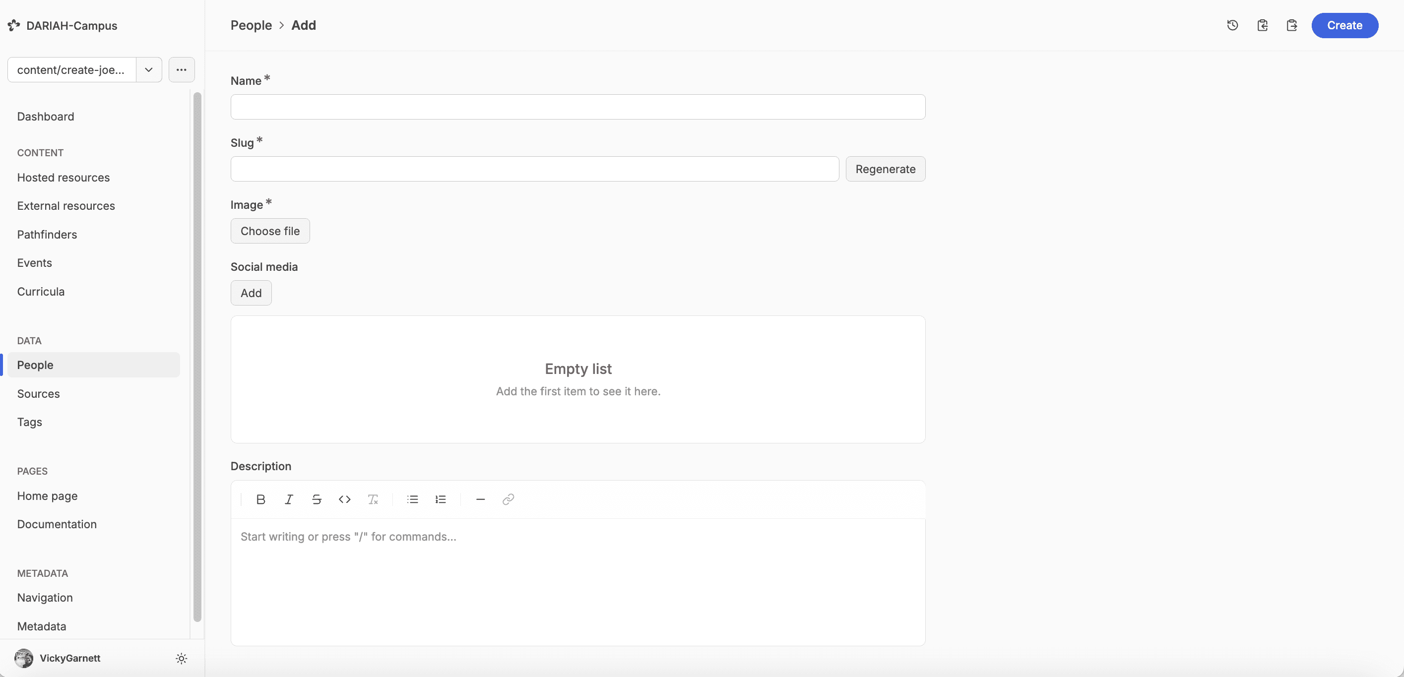 Note, though, that the ‘slug’ field is automatically generated based on the name of the person. You need to check that this fits the ‘lastname-firstname’ format that is used in DARIAH-Campus. If it does not, you will need to change this manually. Do not hit the ‘Regenerate’ button as this will reset the slug back to the incorrect form.