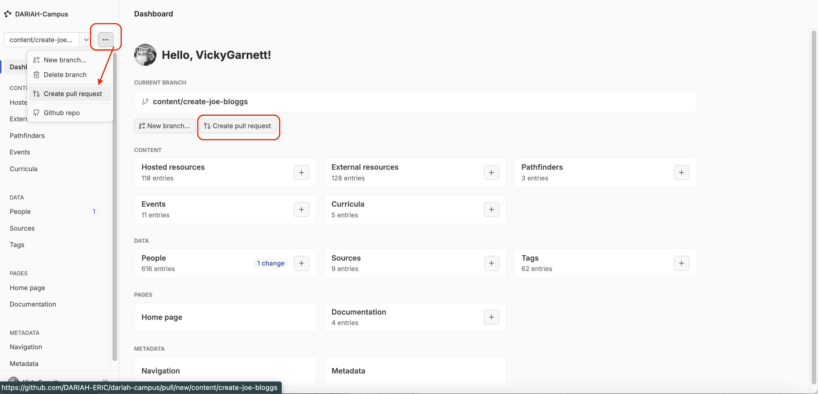 The content management system (version launched in March 2025) allows users to create new resources and make changes to people profiles using the same basic workflow as creating, pushing and pulling commits on GitHub, but through a more user-friendly interface that does not require any experience or knowledge of coding practices. No changes are published to DARIAH-Campus without the approval of the Editorial Board, and any changes you do make remain in a ‘branch’ that is separate from the main DARIAH-Campus website until it is ‘merged’ (published). This means that you can work on your resource without worrying too much about making any catastrophic changes that break the DARIAH-Campus website, as the editorial team won’t let it get that far!