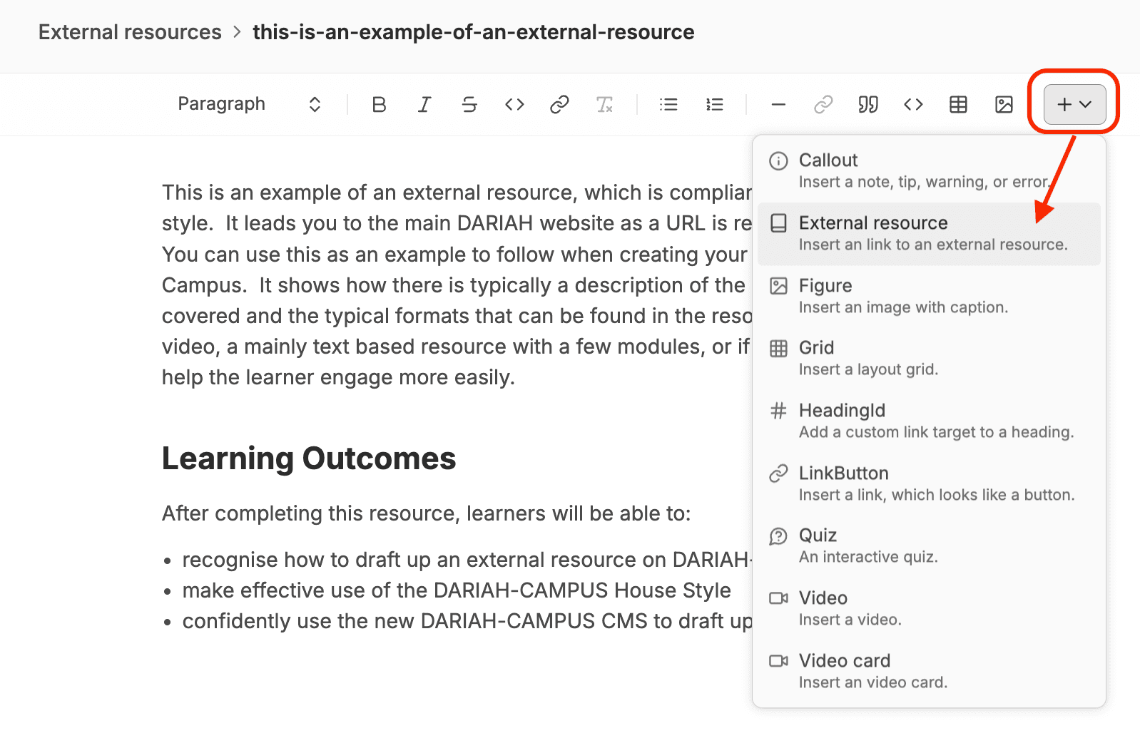 Below the ‘Learning Outcomes’ you should now add the ‘External Resource’ widget. All the widgets for resources can be found by clicking on the dropdown menu indicated with a plus sign on the end right of the formatting options. From this dropdown menu, select the ‘External Resource’ option.