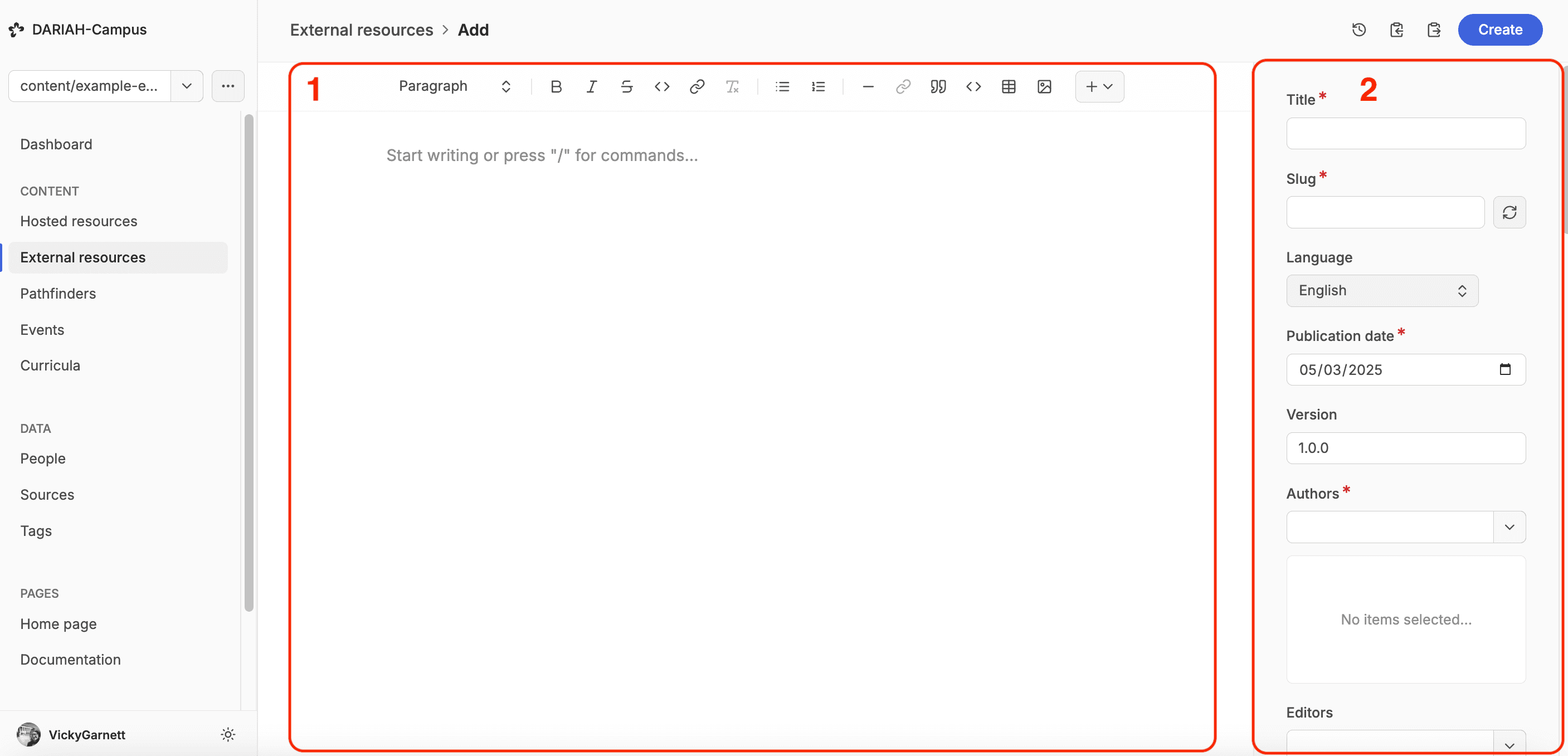 The workspace for an external resource has two main parts. In the middle (1) is the workspace for the more free-hand creative part of the resource, where you will write the description and add the other ‘External Resource’ widgets. But for now the first part to complete is the metadata template (2) which indicates which fields are required with an asterisk.