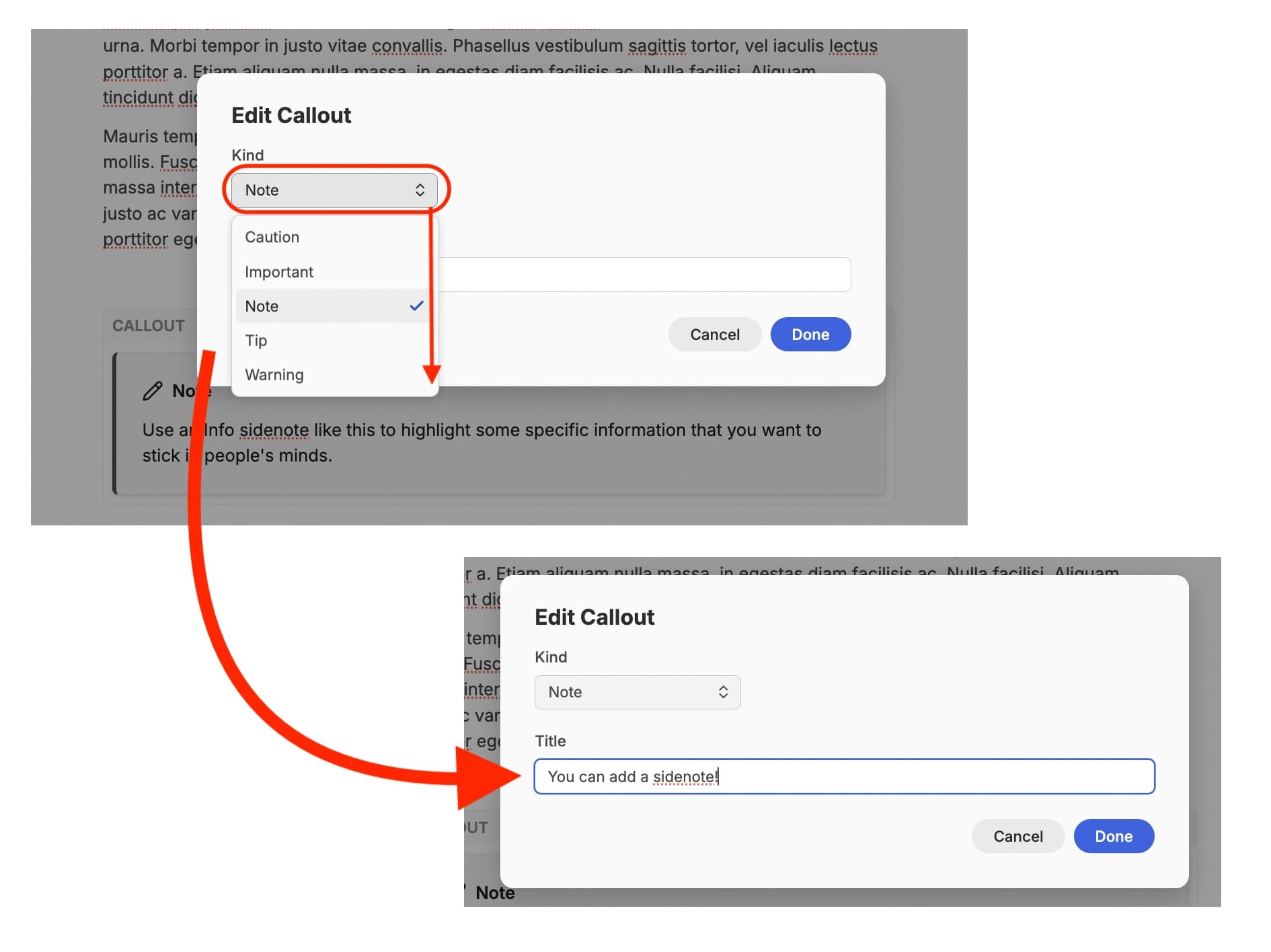 When you first click on this option, a blank ‘Note’ box will appear where you had your cursor. At the same time, a ‘pop-up’ will appear allowing you to edit this. You can choose from different types of call out, and this will determine the colour of the box when it appears in the resource. You can also edit the title of the note, leaving it as its default, or changing it to something more specific to your content.