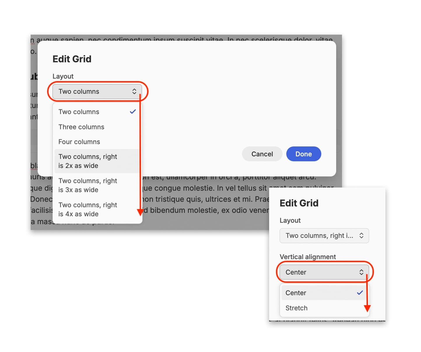 The ‘Layout’ drop-down menu allows you to pick how many columns and rows you would like, along with how wide you would like each column to be. The ‘Vertical Alignment’ drop-down menu determines whether text fills the cell it’s in, or sits centrally within it.