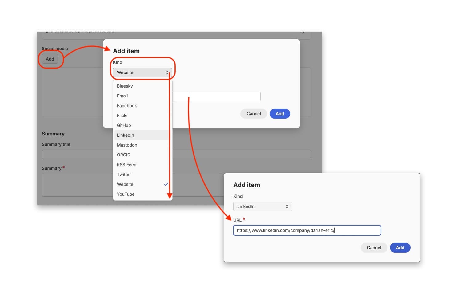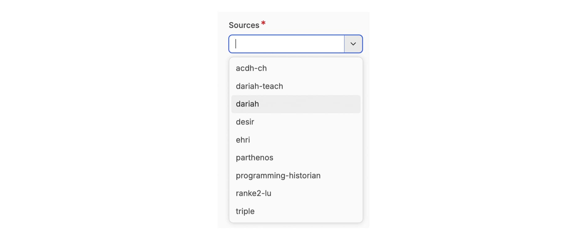 Sources are also selected in the same way. The ‘Source’ is used to assign a ‘channel’. In most cases, the source is ‘DARIAH’, unless you already have a dedicated ‘channel’ in place as agreed with the DARIAH-Campus Editorial Board.