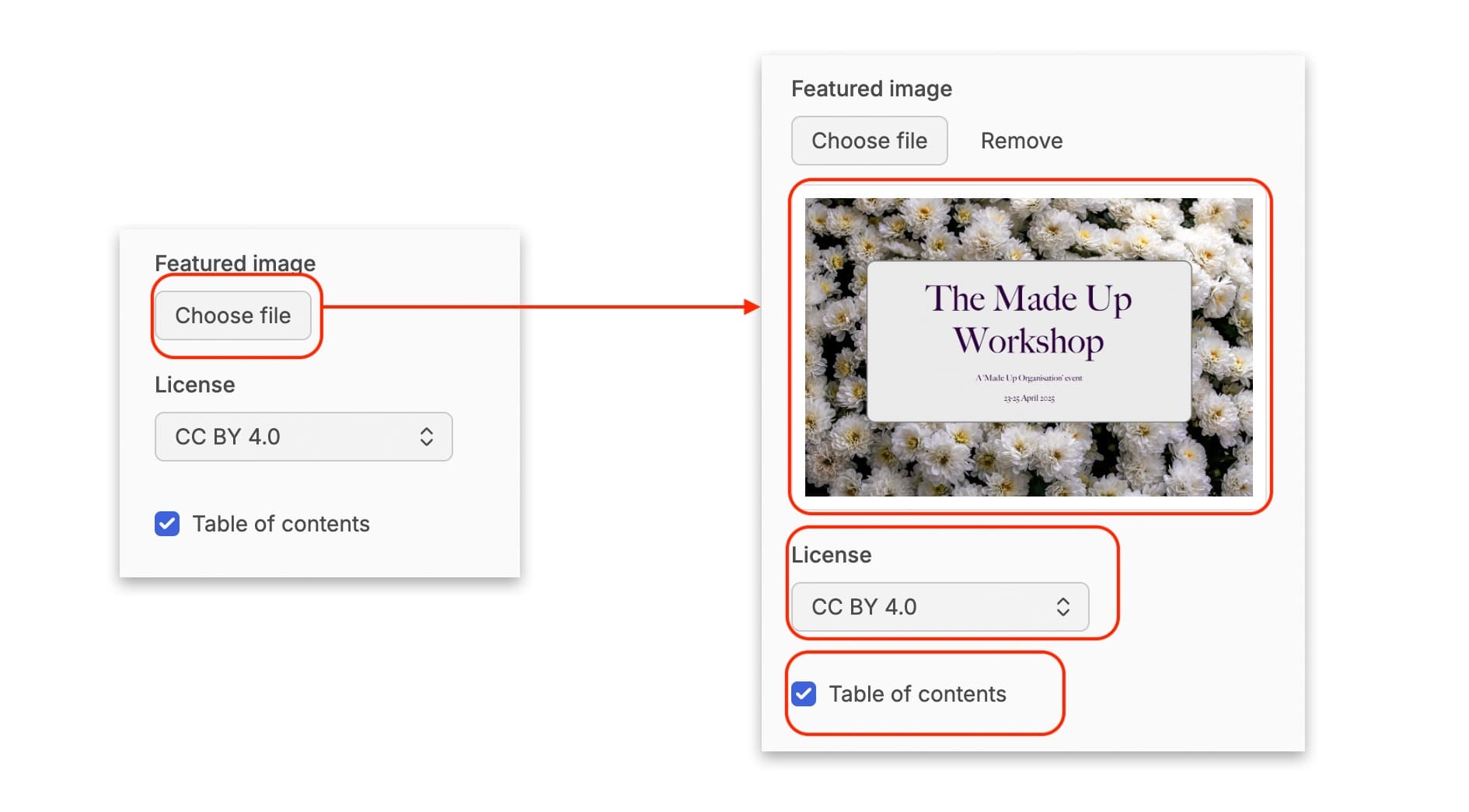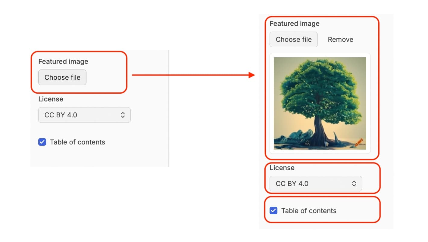 You can also choose to add a ‘Featured Image’. Click on the ‘Choose File’ button. This will open the appropriate file management window for your operating system (e.g. Finder for Mac, File Explorer for Windows) to allow you to select an image from your own computer. One selected and confirmed, the featured image will be displayed as a thumbnail in this metadata field. You will also now have the option to remove this file if you choose.