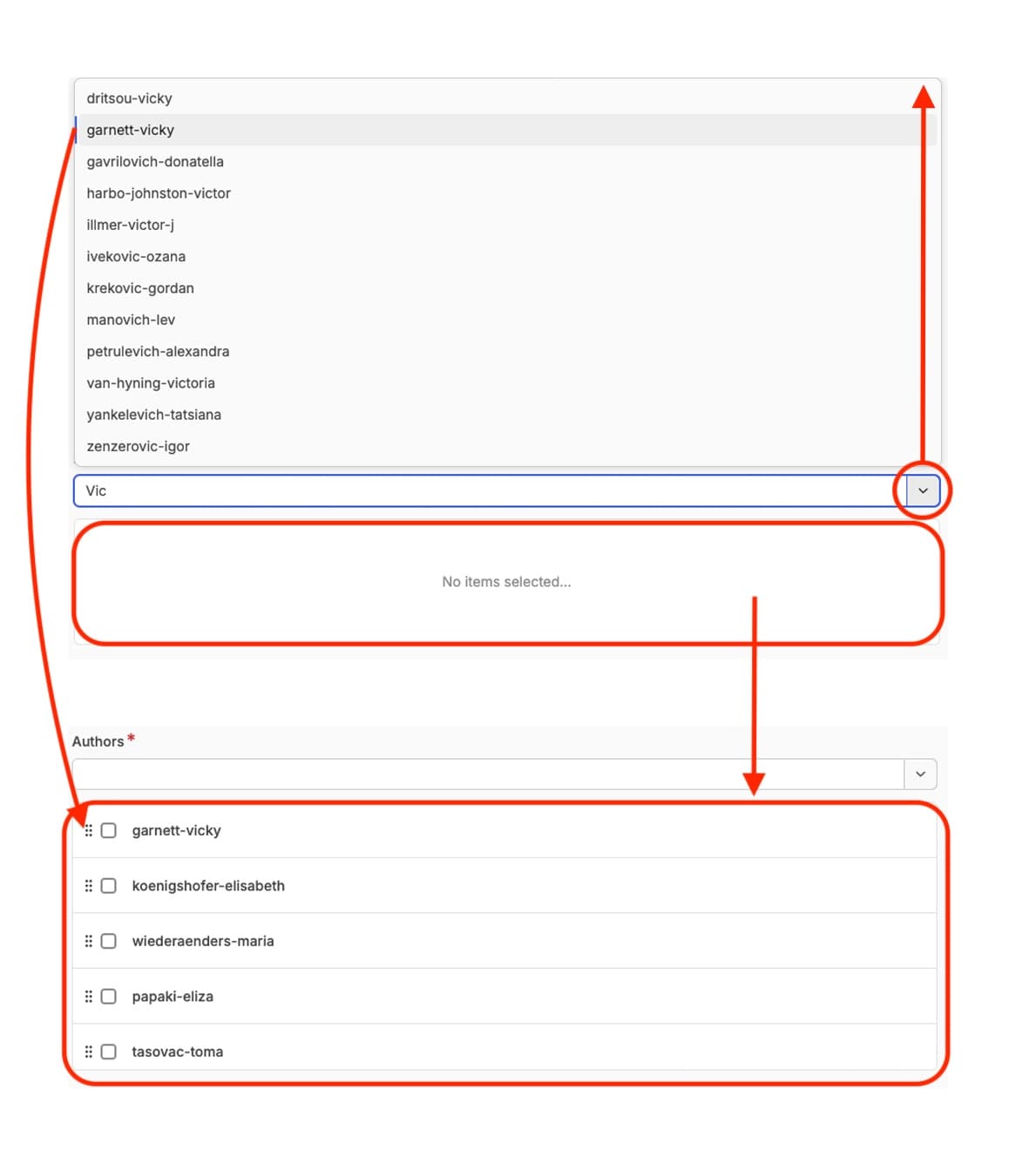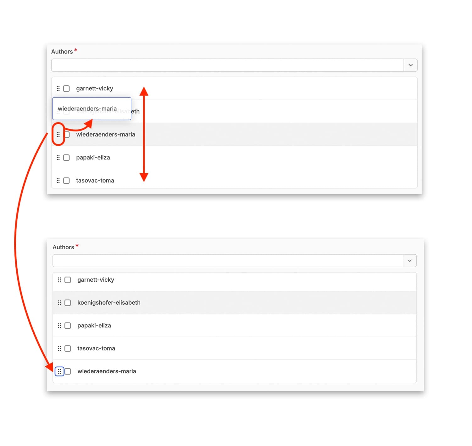 Once you have selected an author or authors, it will appear in a box below the drop down menu. For each person there is the option to change the order of authors listing, indicated by an icon featuring six dots, or the option to select that author, indicated by a checkbox, so that you can remove them from the list if required.