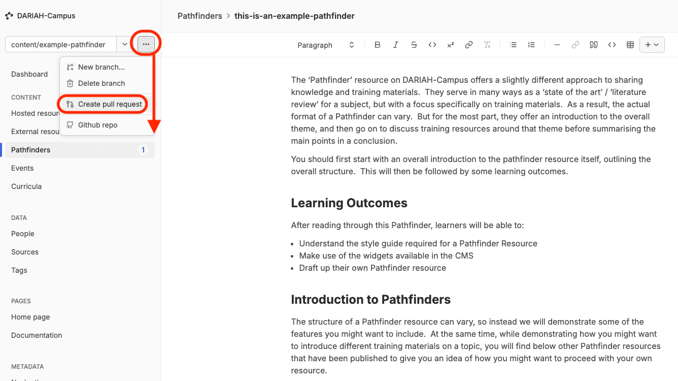 Once you are happy with your curriculum, you may wish to ‘create’ a pull request, and save your work. You can of course do this at any point in the editing process once the required event metadata has been entered. Exactly when you choose to create the pull request and save your work is up to you, depending on your own practices, although we recommend saving frequently after a set of changes.