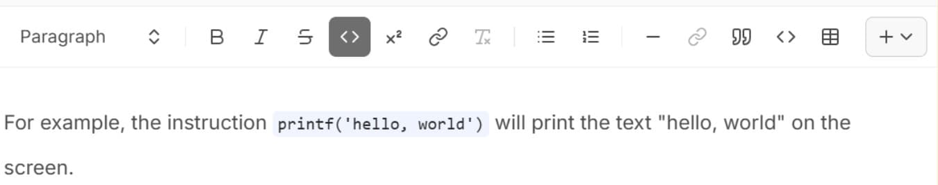 Inline Code - There are two ‘code’ icons on this formatting bar. This one on the left, the ’<>’ icon, allows you to format one or more words in your paragraph as code. Use it for short snippets of code, variable names, file paths, or short instructions.