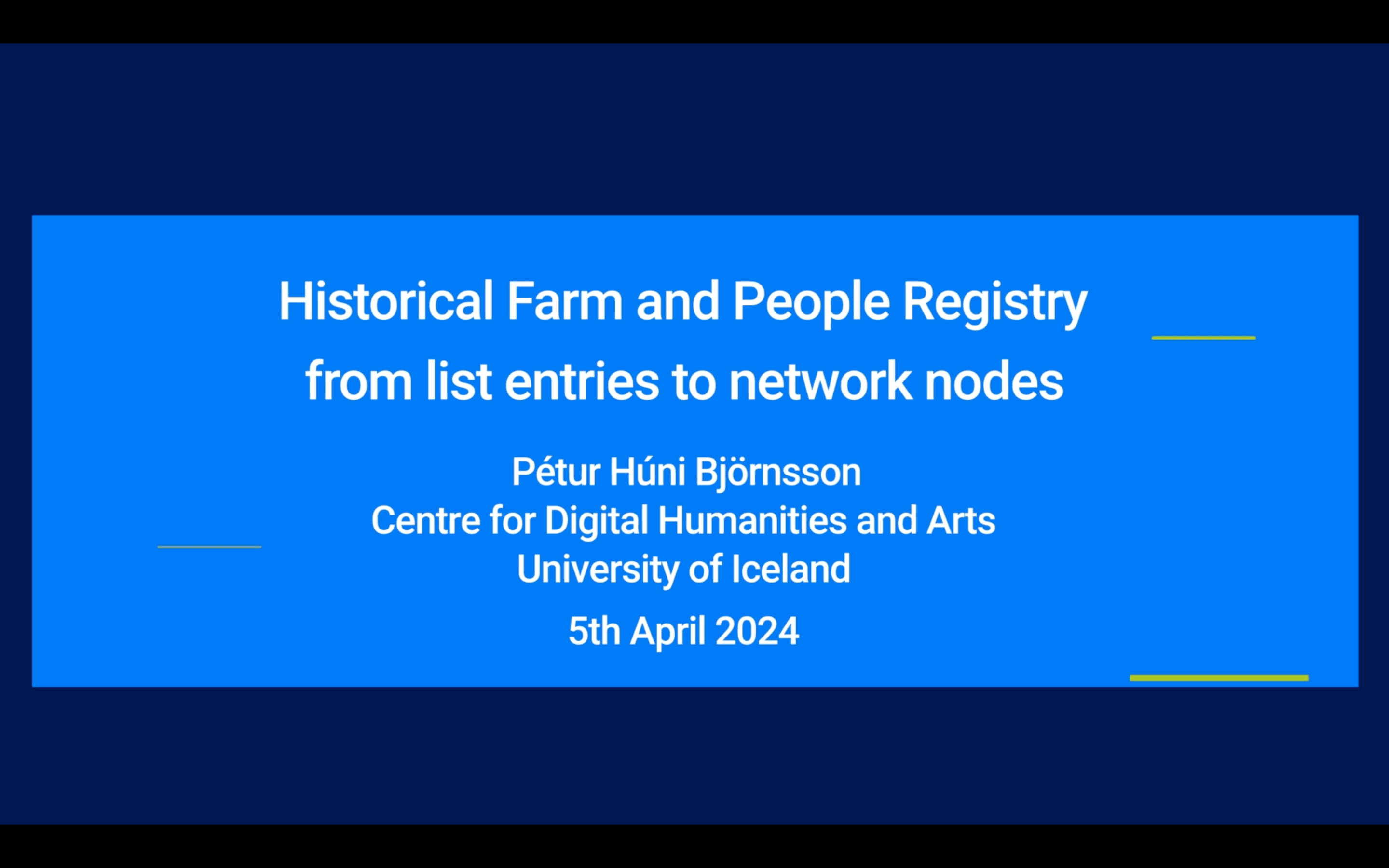 The aim of developing the Historical Farm and People Registry is to create a reliable infrastructure for research involving data on people and places in Iceland from 1703 to 1920. This has been done by (a) establishing a reliable historical farm registry, (b) mapping census data onto the farm registry, and (c) connecting people between censuses, and thereby transforming the static lists of the censuses into an interconnected network of nodes. This presentation will outline the aim and scope of the project, explain the development process and problems encountered on the way, and demonstrate a use case for the ‘final’ product.